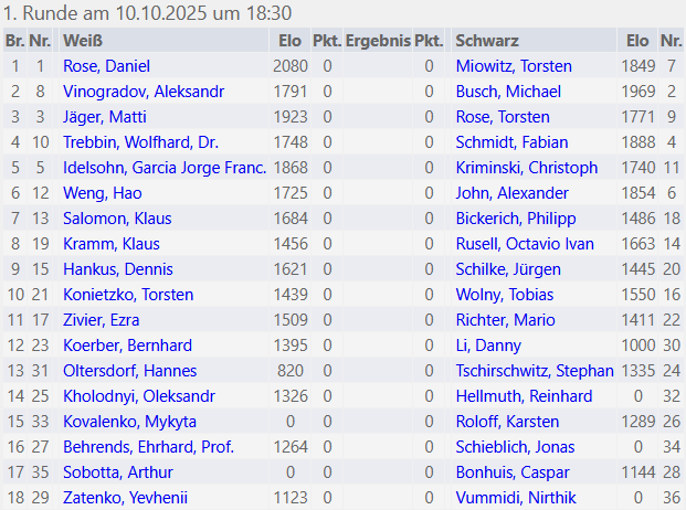 Wir haben fantastische 36 Teilnehmer und die erste Runde startet am Freitag, dem 10.10.2025 um 18:30 Uhr in der Freizeitstätte Süd mit folgenden Paarungen: