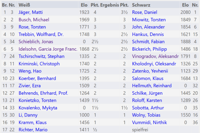 Morgen, am Freitag, dem 9.1. läuft die vierte Runde der gemeinsamen Vereinsmeisterschaft. Diese Runde findet wieder bei SG Lasker Steglitz-Wilmersdorf in der DRK Seniorenbegegnungstätte, Schlangenbader Straße 11, 14197 Berlin statt. Hier sind die Paarungen:
