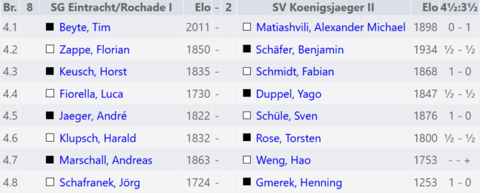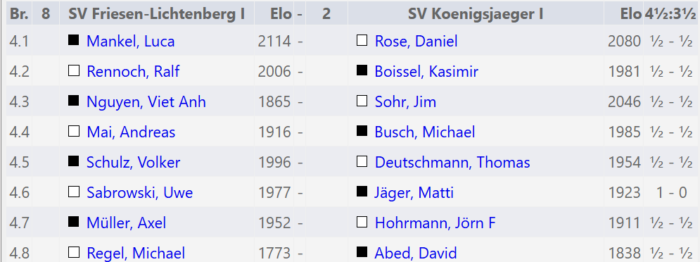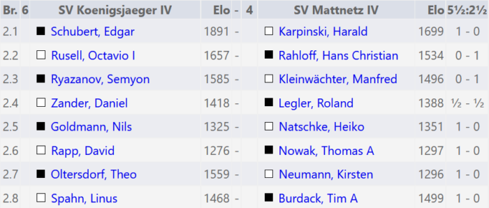Die vierte Mannschaft verliert leider auch in der 7. Runde, diesmal deutlich mit 2:6 gegen SK König Tegel IV. Mit weiterhin 2 Mannschaftspunkten liegen wir auf den 9. Tabellenplatz der Stadtklasse 2.4 und brauchen in den nächsten Runden Siege gegen den 6. und 8. der Tabelle, um den Abstiegsplatz 9 noch zu verlassen.