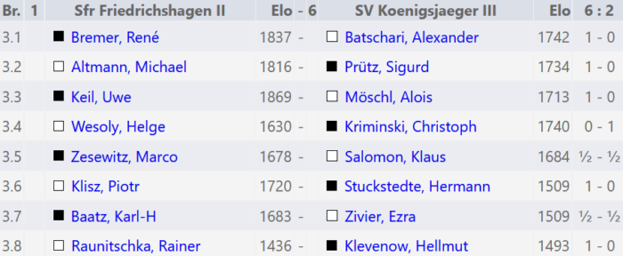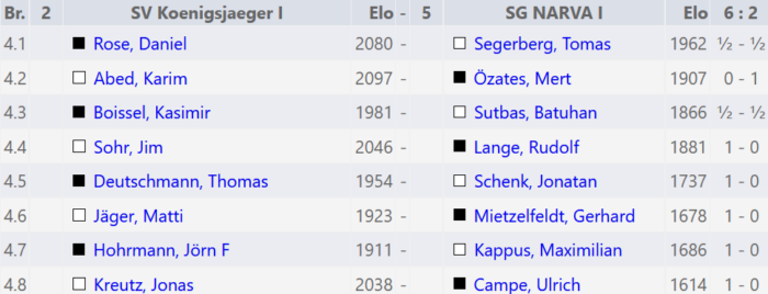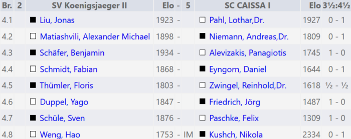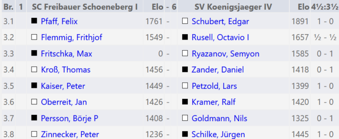 Die vierte Mannschaft setzt ihre 3,5:4,5 Unglücksserie leider auch in der 6. Runde gegen Freibauer Schöneberg fort.