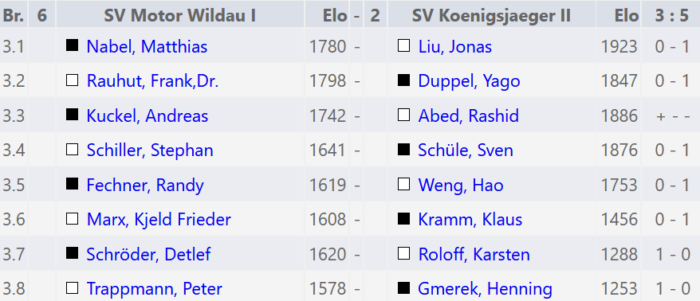 Die zweite Mannschaft gewinnt gegen SV Motor Wildau I trotz einer kampflosen Niederlage klar mit 5:3. Hier wurden alle Partien entschieden! Wir verbessern uns damit um einen Platz auf den 5. Tabellenplatz der Stadtklasse 1.2.