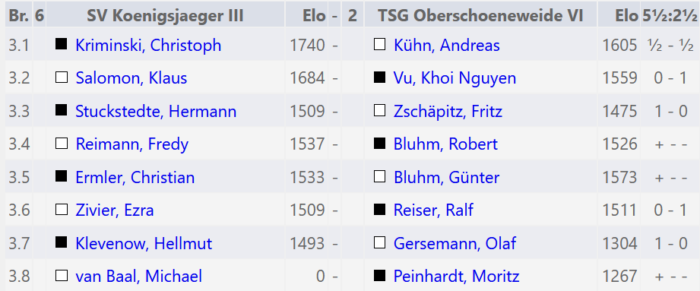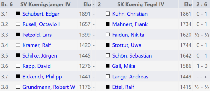 Die vierte Mannschaft verliert leider auch in der 7. Runde, diesmal deutlich mit 2:6 gegen SK König Tegel IV. Mit weiterhin 2 Mannschaftspunkten liegen wir auf den 9. Tabellenplatz der Stadtklasse 2.4 und brauchen in den nächsten Runden Siege gegen den 6. und 8. der Tabelle, um den Abstiegsplatz 9 noch zu verlassen.