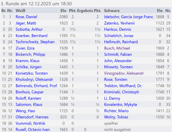 Am kommenden Freitag findet um 18:30 Uhr die 3. Runde der gemeinsamen Vereinsmeisterschaft mit SG Lasker Steglitz-Wilmersdorf in der Freizeitstätte Süd statt. Es gibt folgende Paarungen: