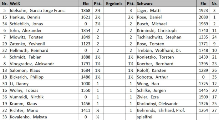 Morgen, am Freitag, dem 9.1. läuft die vierte Runde der gemeinsamen Vereinsmeisterschaft. Diese Runde findet wieder bei SG Lasker Steglitz-Wilmersdorf in der DRK Seniorenbegegnungstätte, Schlangenbader Straße 11, 14197 Berlin statt. Hier sind die Paarungen: